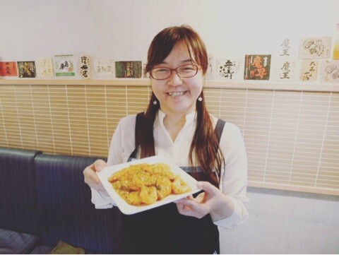 こちらが香織先生です。明るくやさしく、お料理愛にあふれた先生でみんな香織さんのことが大好き。そんな方です。ちなみに手に持っているのが「台湾風エビチリ」。思い出しても美味しかった……!