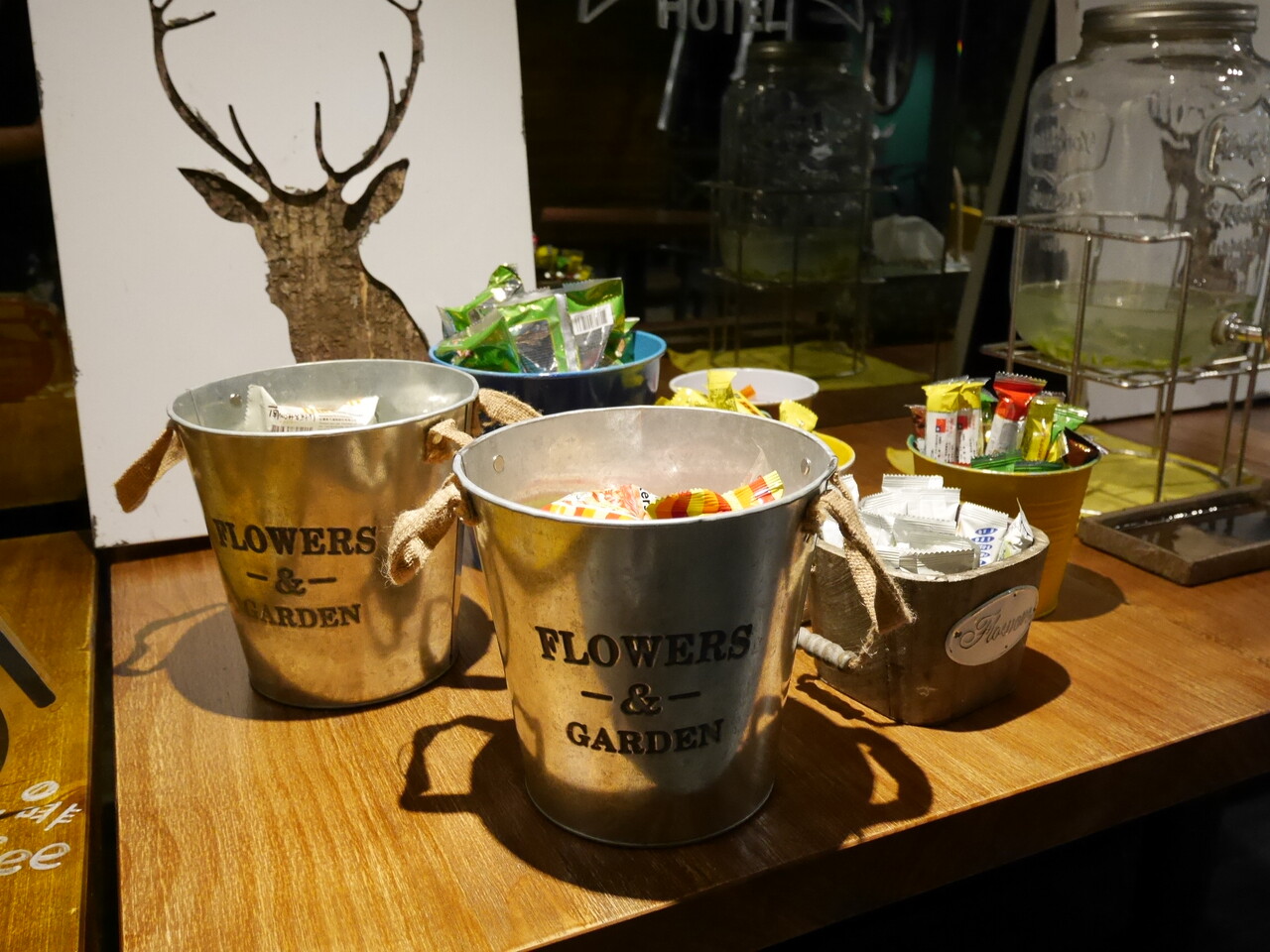 ここはご自由にどうぞな飲み物とおやつのコーナー