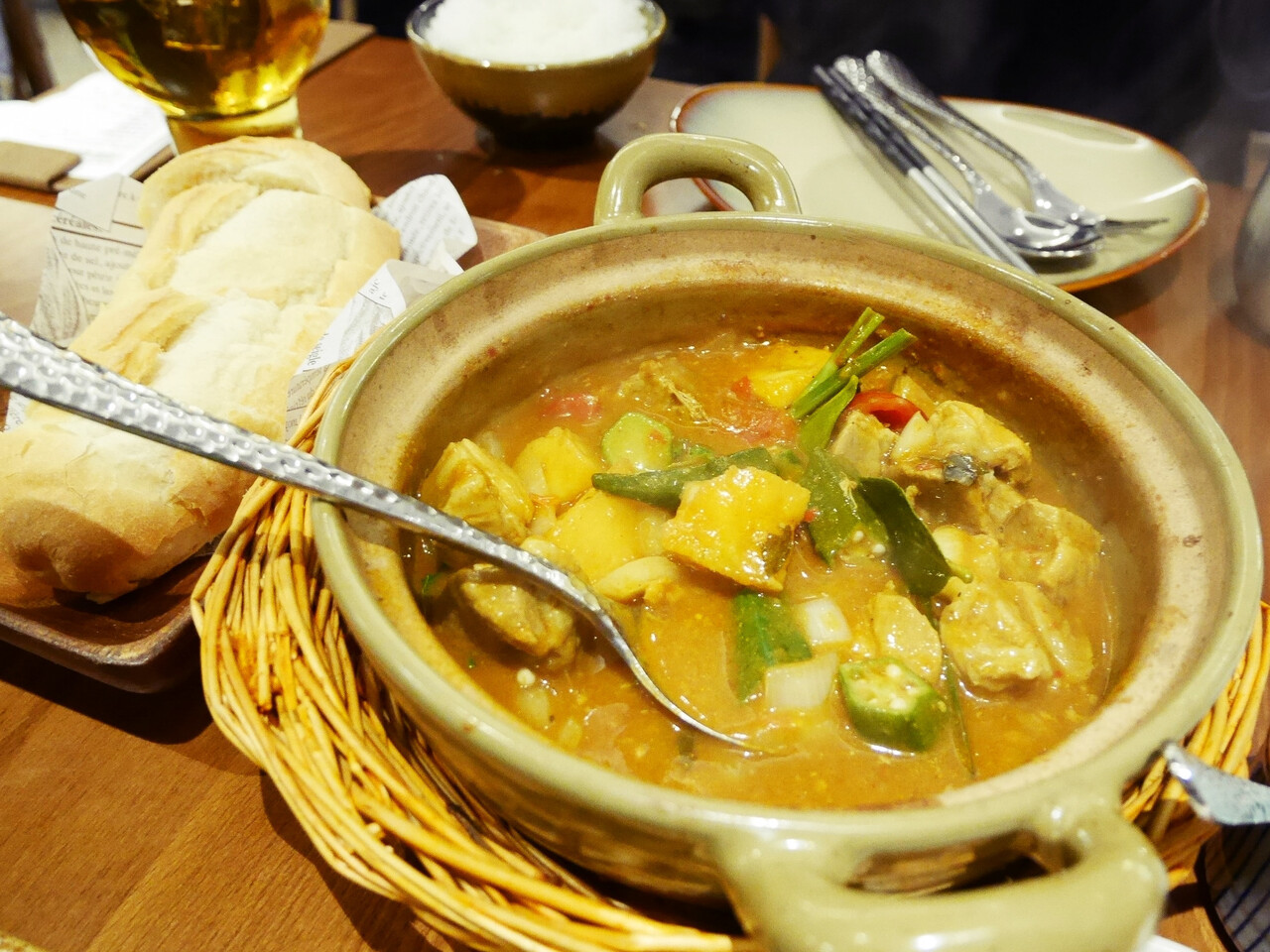 豚肉のラクサ(米があるのにパンも来た!でもベトナムサンドのあのパンと一緒だ!と感動。ついぱくぱく食べてしまうほどおいしかった……!)と鶏もものロースト