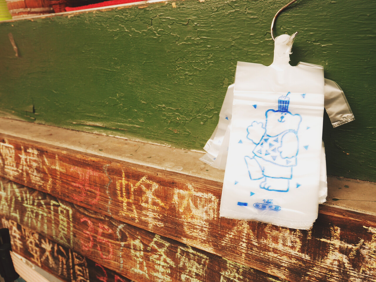 台湾のドリンクスタンドでは袋の有料化がはじまっていますが、こちらはご自由にどうぞスタイルで外にこの可愛らしい袋が吊り下げてありました。