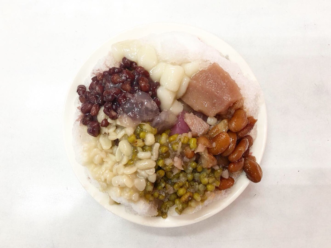 小豆、ピーナッツ、緑豆、金時豆にタロイモと白玉、そして中央のわらび餅のようなもちもち系のなにかなど。笑