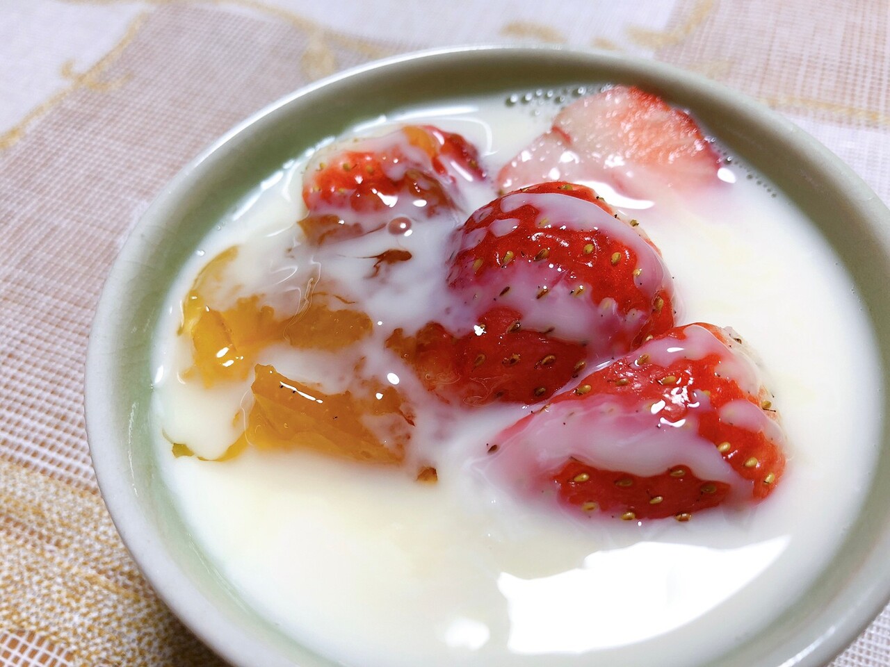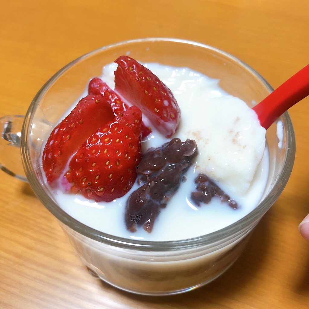 両方無糖なので、フルーツをトッピングして、豆乳をかける前に練乳もかけて少し甘みもプラスするのがお気に入りの食べ方。