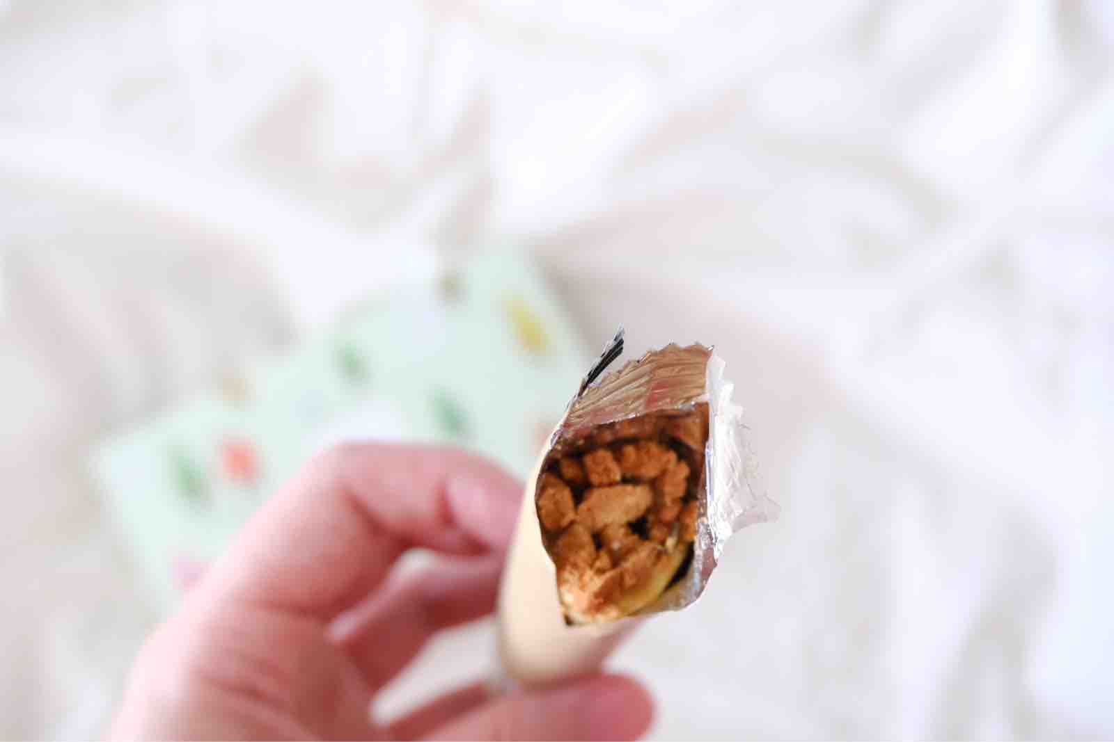 袋を開けるとこのような感じで、エッグロールにピッタリサイズの袋なので、すごく取り出しづらかった……。割れていないのが逆にすごいと思うほど。