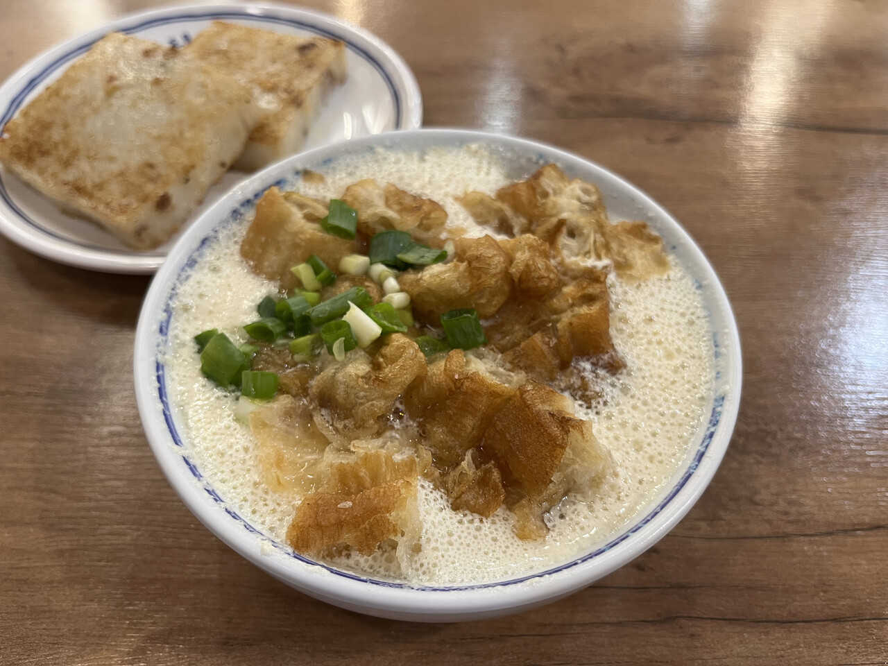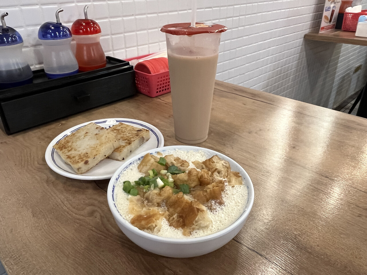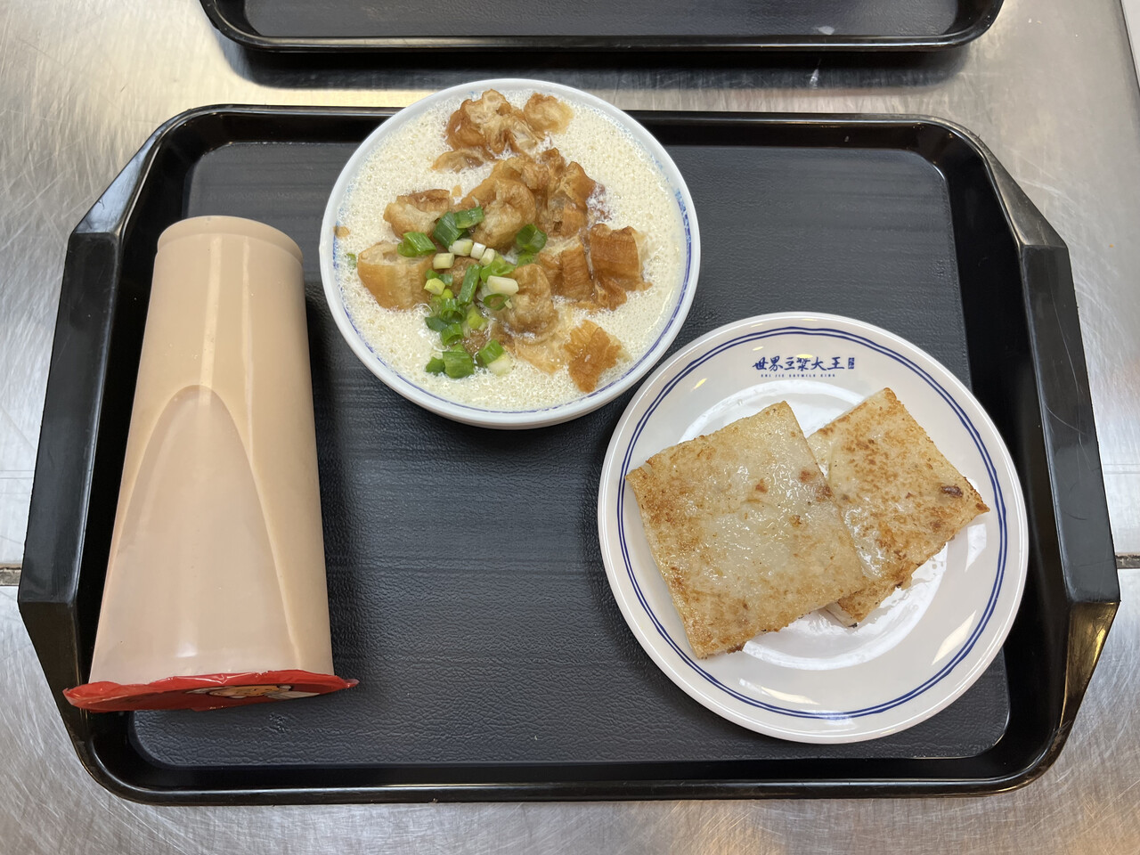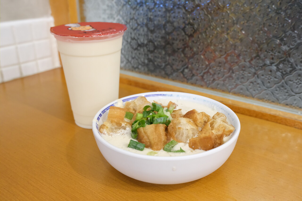 温かい塩味のたべる豆乳「鹹豆漿」は絶対に食べようと思っていて、そのほかは迷ったけれどつい欲が出て大根餅と、喉も乾いていたので豆乳紅茶をオーダー。