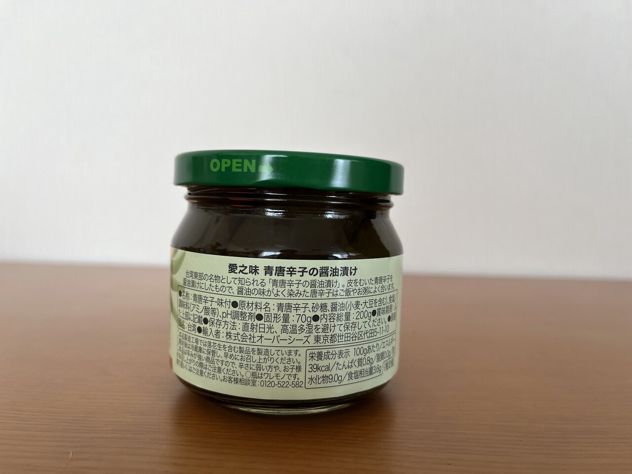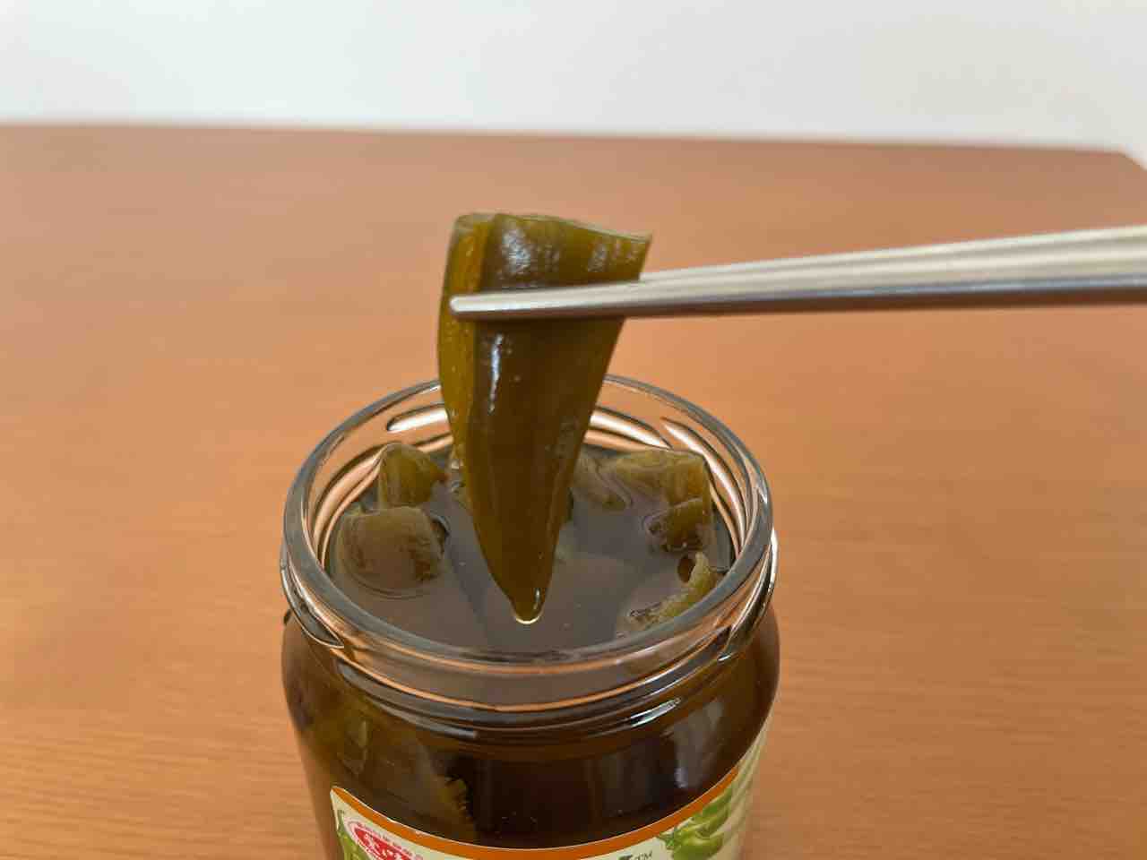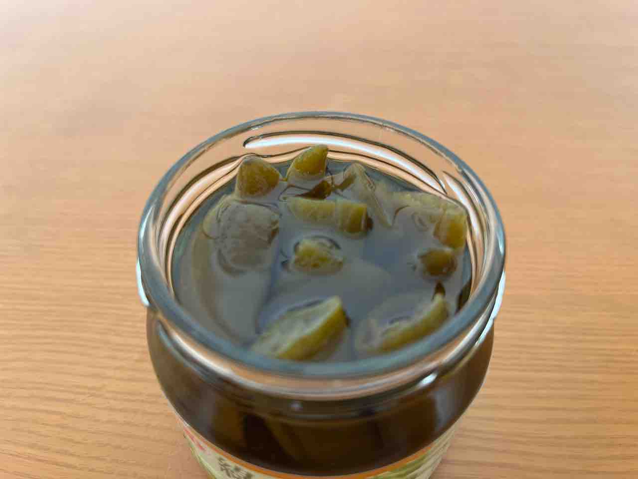 蓋を開けるとこのような感じで、液体に皮を剥いた青唐辛子が漬かっています。